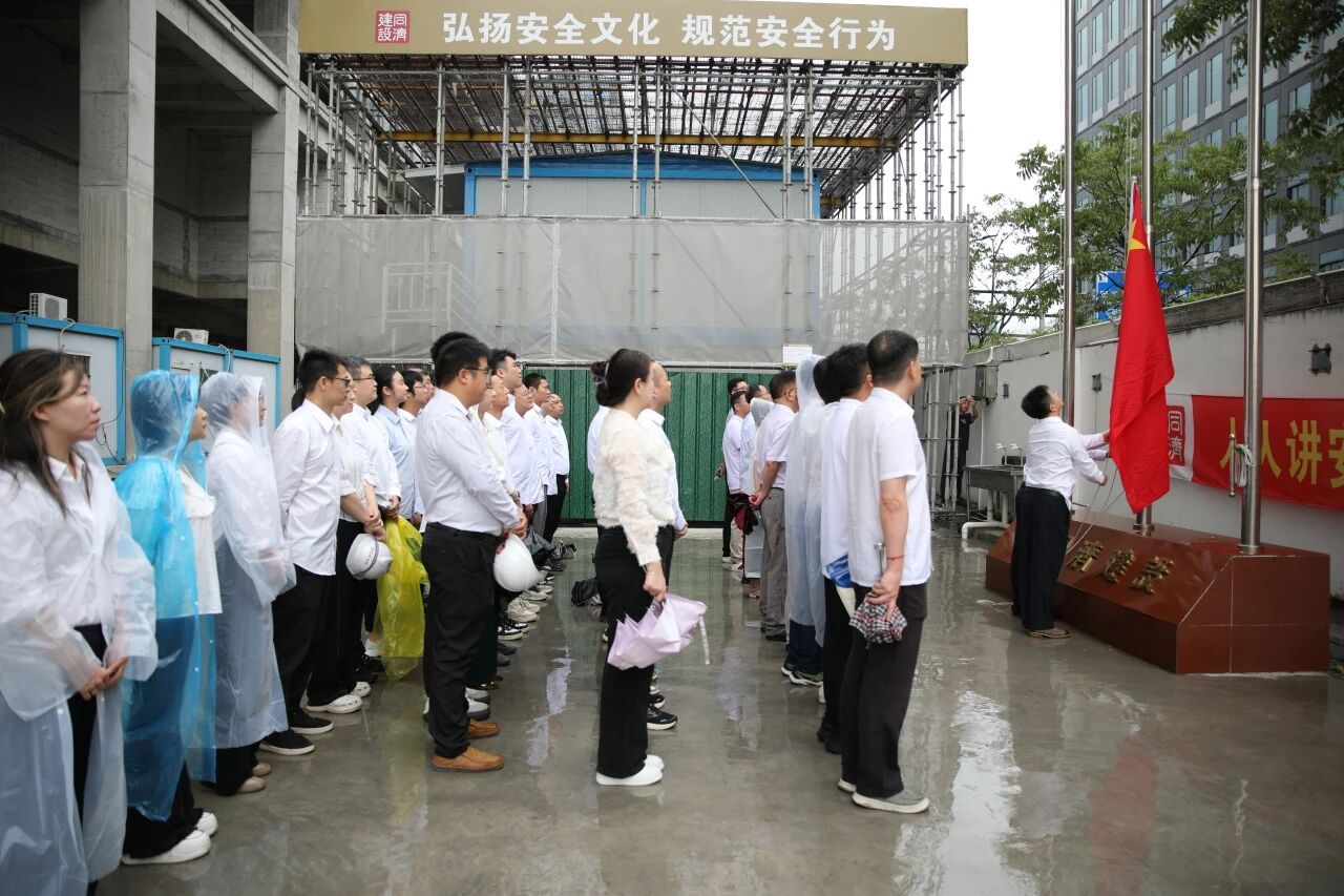 爱国之情,风雨无阻。为热烈庆祝中华人民共和国成立76周年,弘扬爱国主义精神,凝聚奋进力量,9月30日上午,同济科技在同济科技未来中心项目冒雨隆重举行升旗仪式。